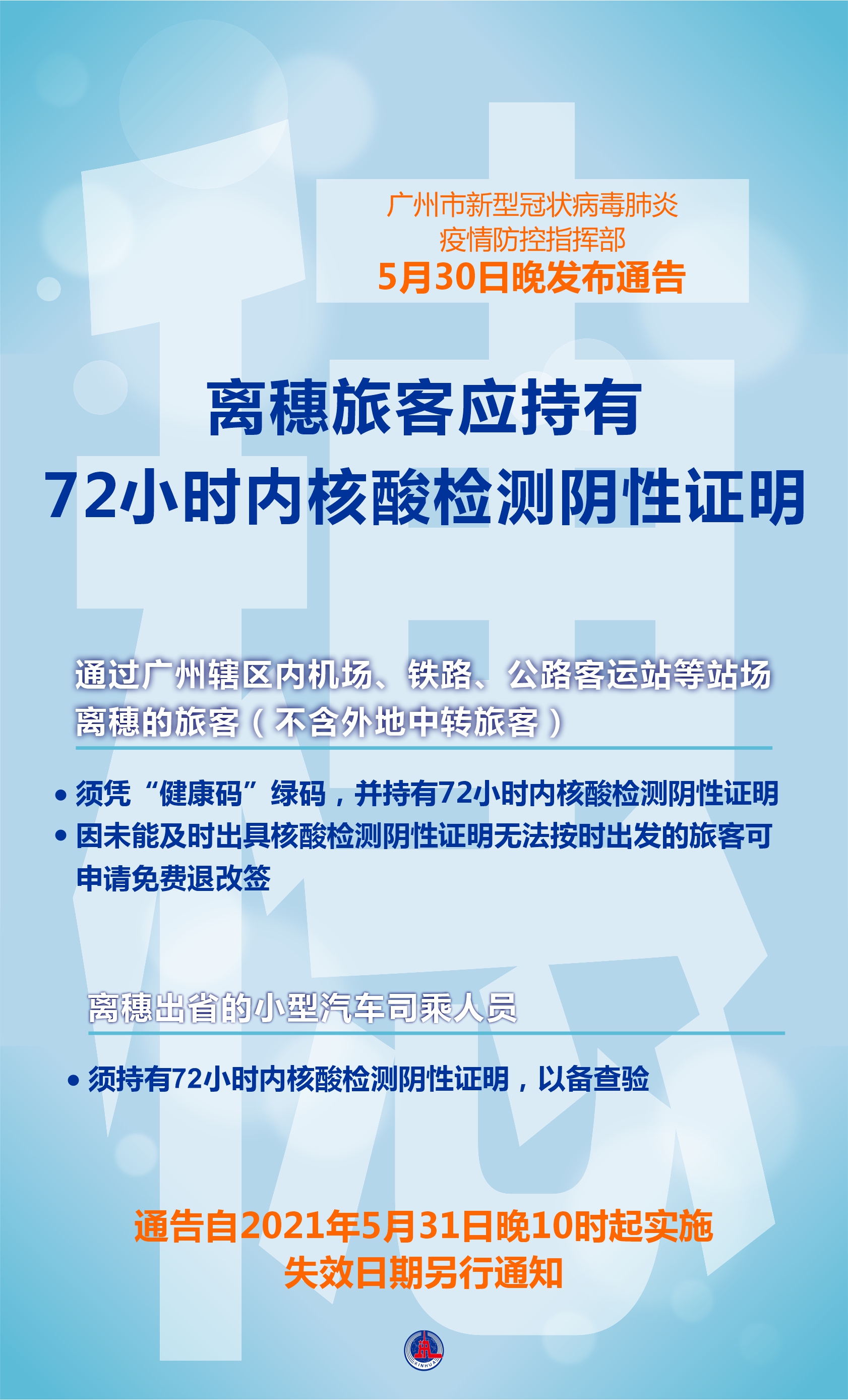海報:離穗旅客應持有72小時內(nèi)核酸檢測陰性證明