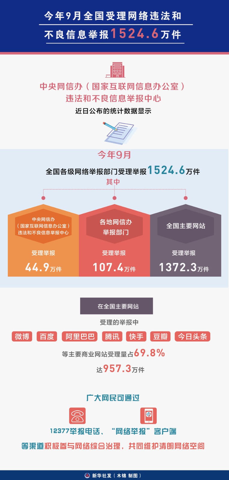 中央網(wǎng)信辦(國家互聯(lián)網(wǎng)信息辦公室)違法和不良信息舉報中心近日公布的統(tǒng)計數(shù)據(jù)顯示,今年9月,全國各級網(wǎng)絡(luò)舉報部門受理舉報1524.6萬件。