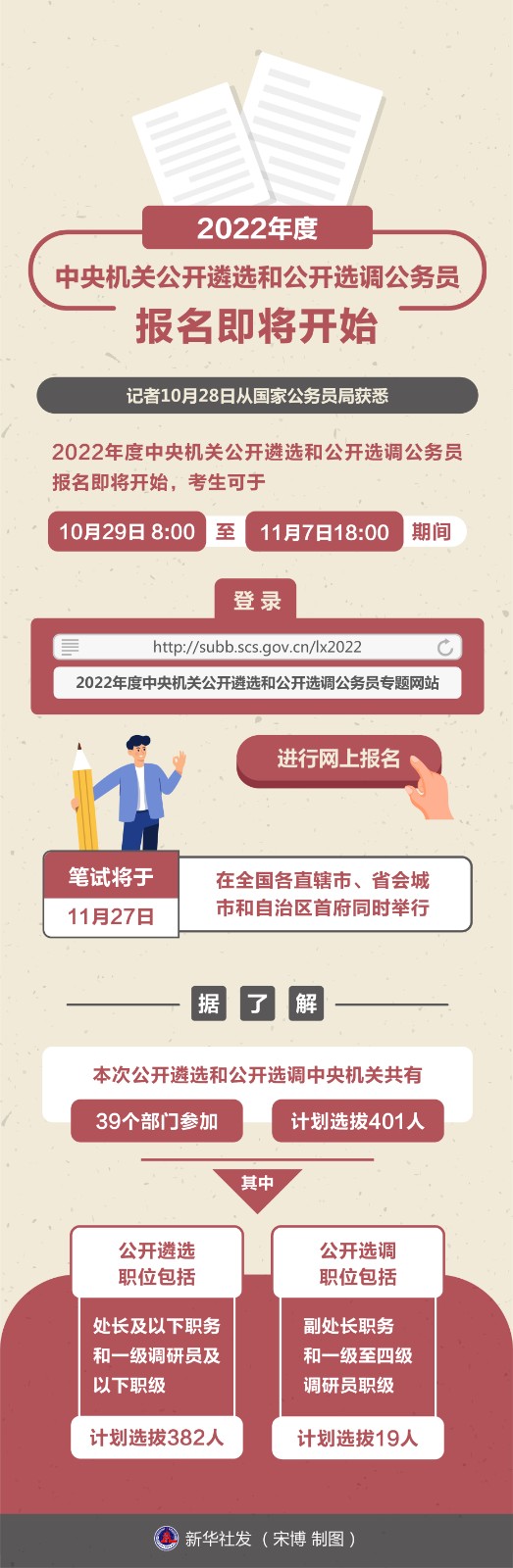 記者10月28日從國家公務(wù)員局獲悉,2022年度中央機(jī)關(guān)公開遴選和公開選調(diào)公務(wù)員報名即將開始,考生可于10月29日8:00至11月7日18:00期間,登錄“2022年度中央機(jī)關(guān)公開遴選和公開選調(diào)公務(wù)員專題網(wǎng)站”(http://subb.scs.gov.cn/lx2022)進(jìn)行網(wǎng)上報名,筆試將于11月27日在全國各直轄市、省會城市和自治區(qū)首府同時舉行。