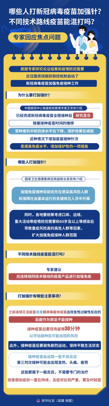 根據(jù)專家研究論證結(jié)果和疫情防控需要,近日國(guó)務(wù)院聯(lián)防聯(lián)控機(jī)制啟動(dòng)了新冠病毒疫苗加強(qiáng)免疫接種工作。哪些人打新冠病毒疫苗加強(qiáng)針?不同技術(shù)路線疫苗能混打嗎?打加強(qiáng)針有哪些注意事項(xiàng)?國(guó)務(wù)院聯(lián)防聯(lián)控機(jī)制有關(guān)專家對(duì)焦點(diǎn)問(wèn)題進(jìn)行回應(yīng)。