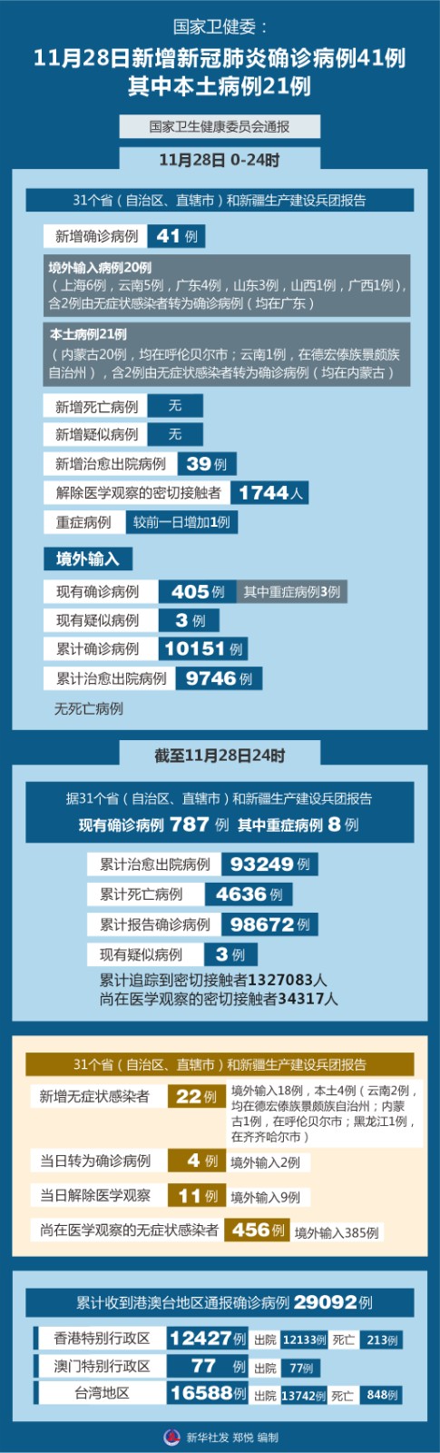 圖表:國(guó)家衛(wèi)健委:11月28日新增新冠肺炎確診病例41例 其中本土病例21例