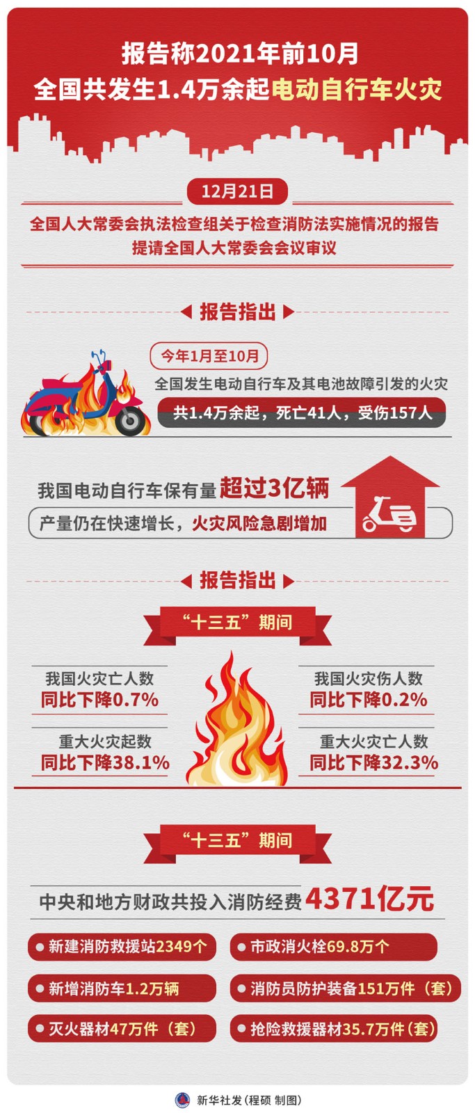 12月21日,全國人大常委會執(zhí)法檢查組關(guān)于檢查消防法實(shí)施情況的報告提請全國人大常委會會議審議。報告指出,今年1月至10月,全國發(fā)生電動自行車及其電池故障引發(fā)的火災(zāi)共1.4萬余起,死亡41人,受傷157人。