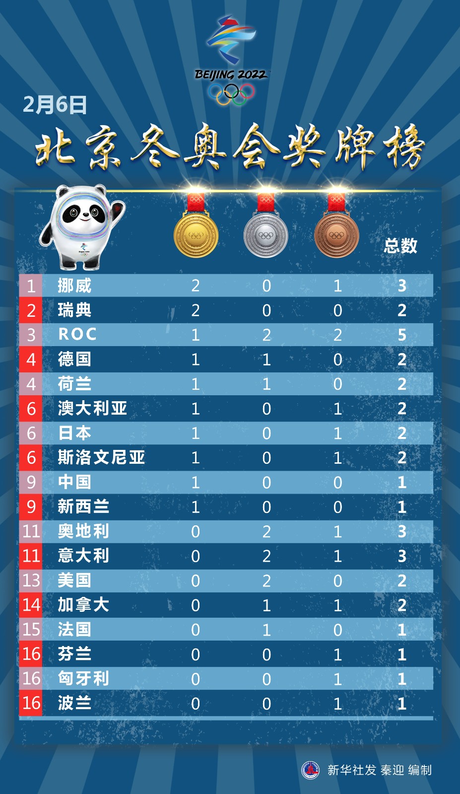 圖表:2月6日北京冬奧會(huì)獎(jiǎng)牌榜