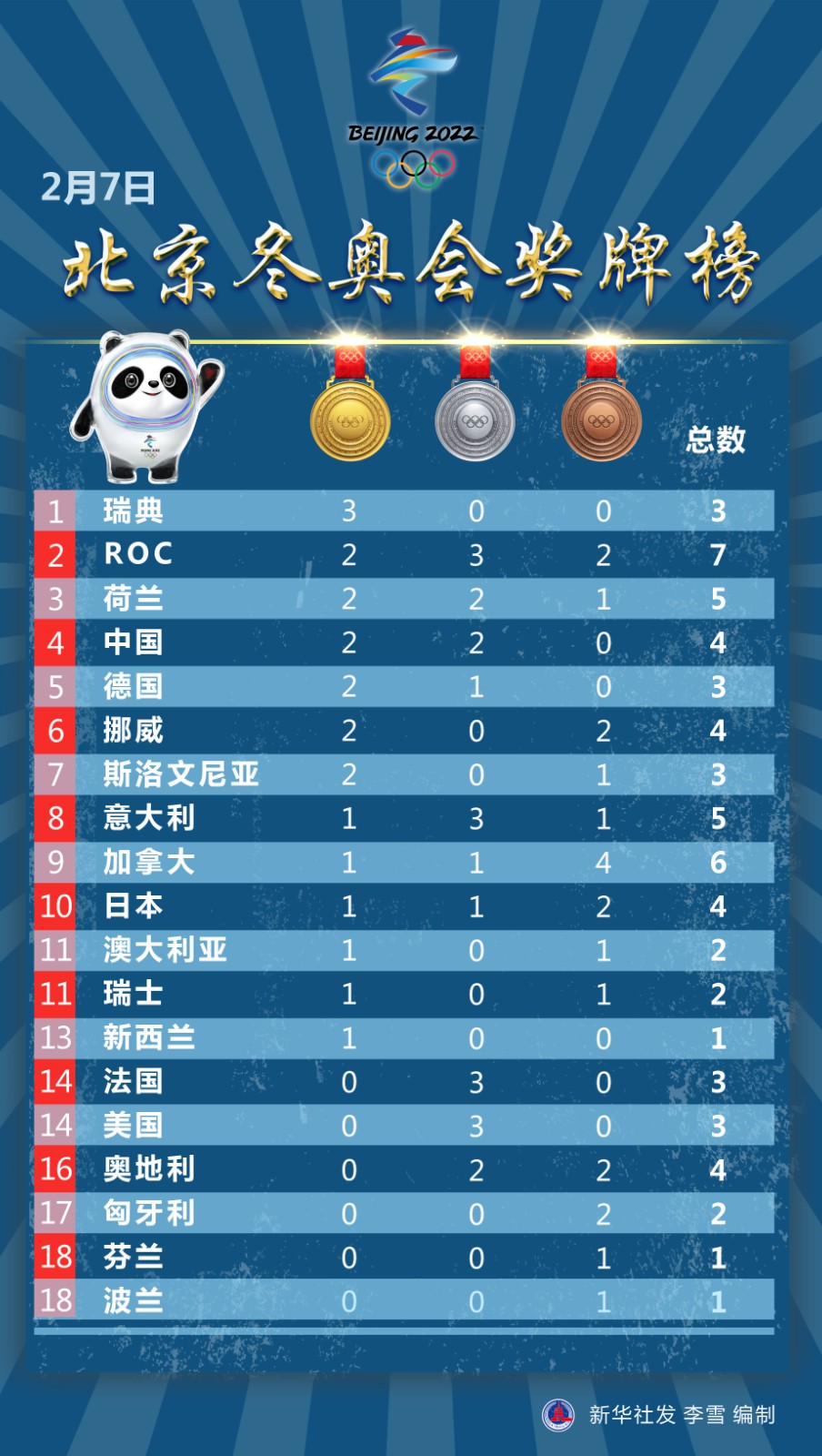 圖表:2月7日北京冬奧會獎牌榜