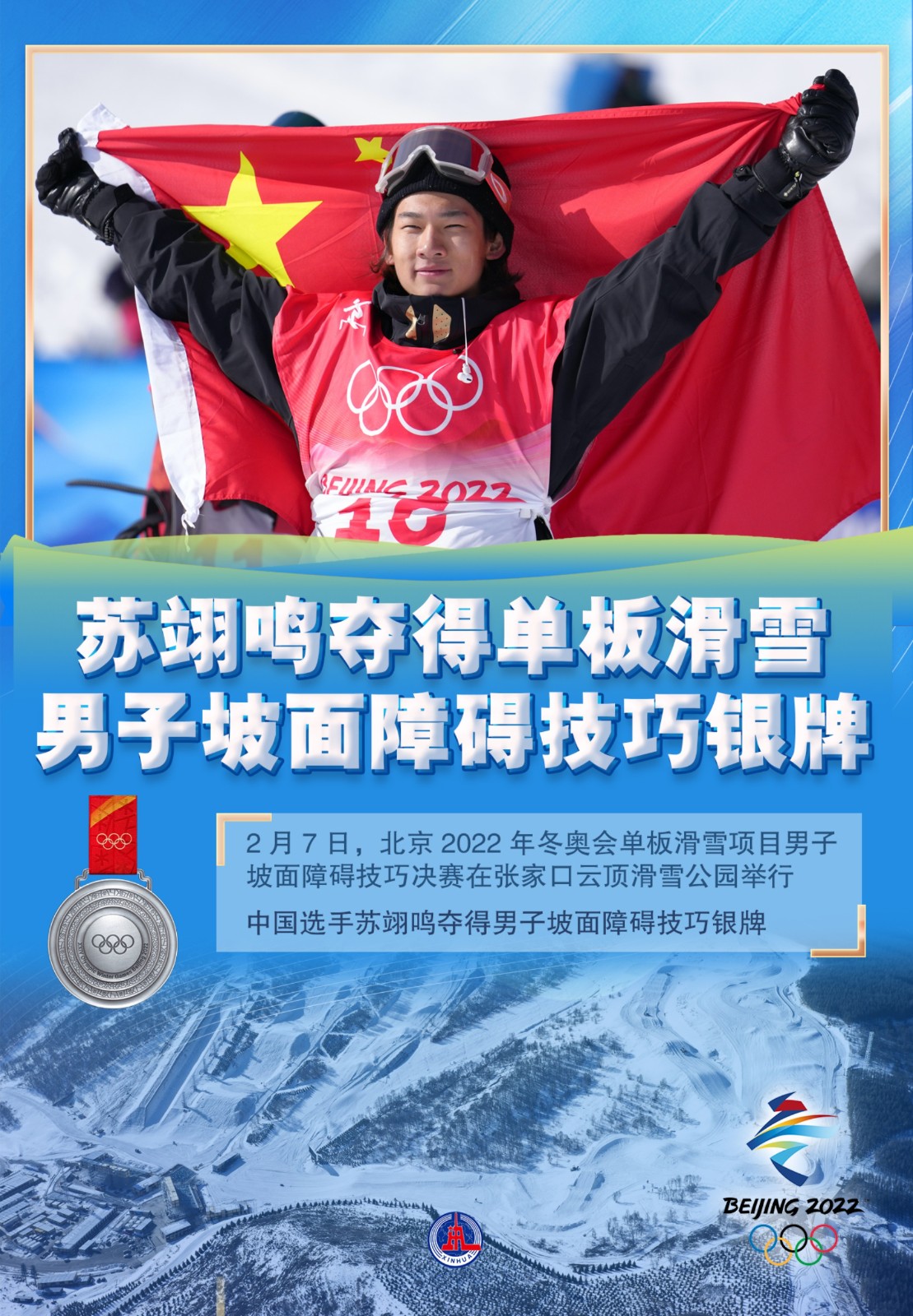 2月7日,北京2022年冬奧會單板滑雪項目男子坡面障礙技巧決賽在張家口云頂滑雪公園舉行。中國選手蘇翊鳴奪得男子坡面障礙技巧銀牌。
