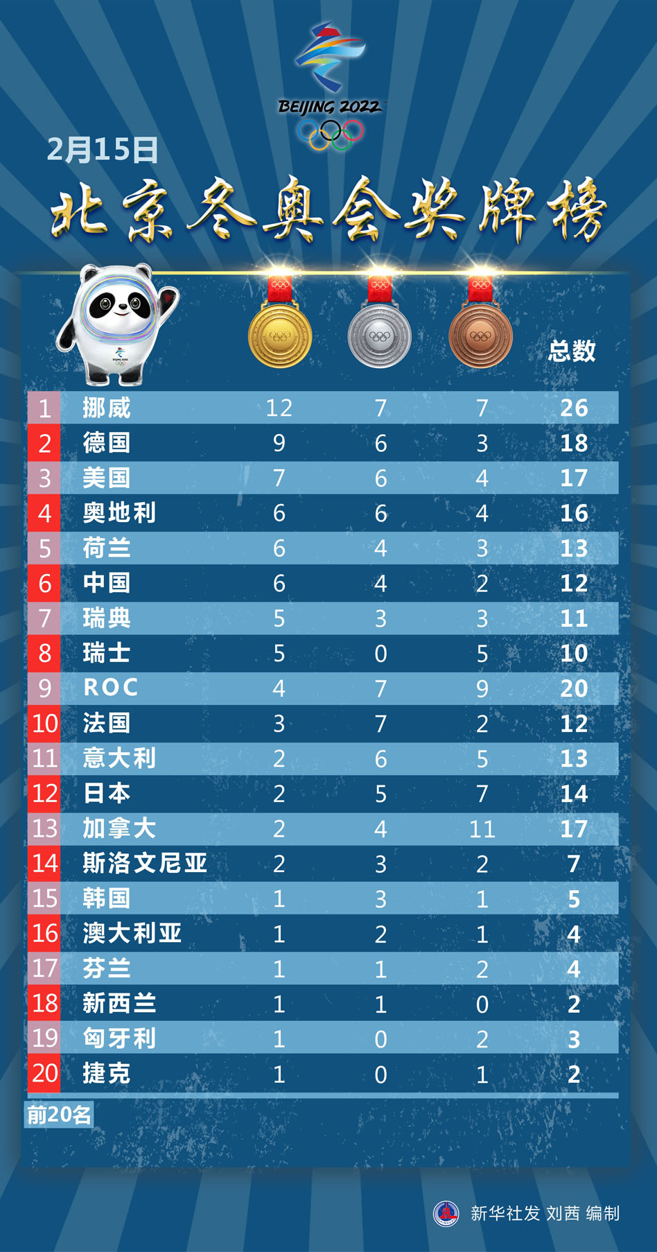 圖表:2月15日北京冬奧會(huì)獎(jiǎng)牌榜