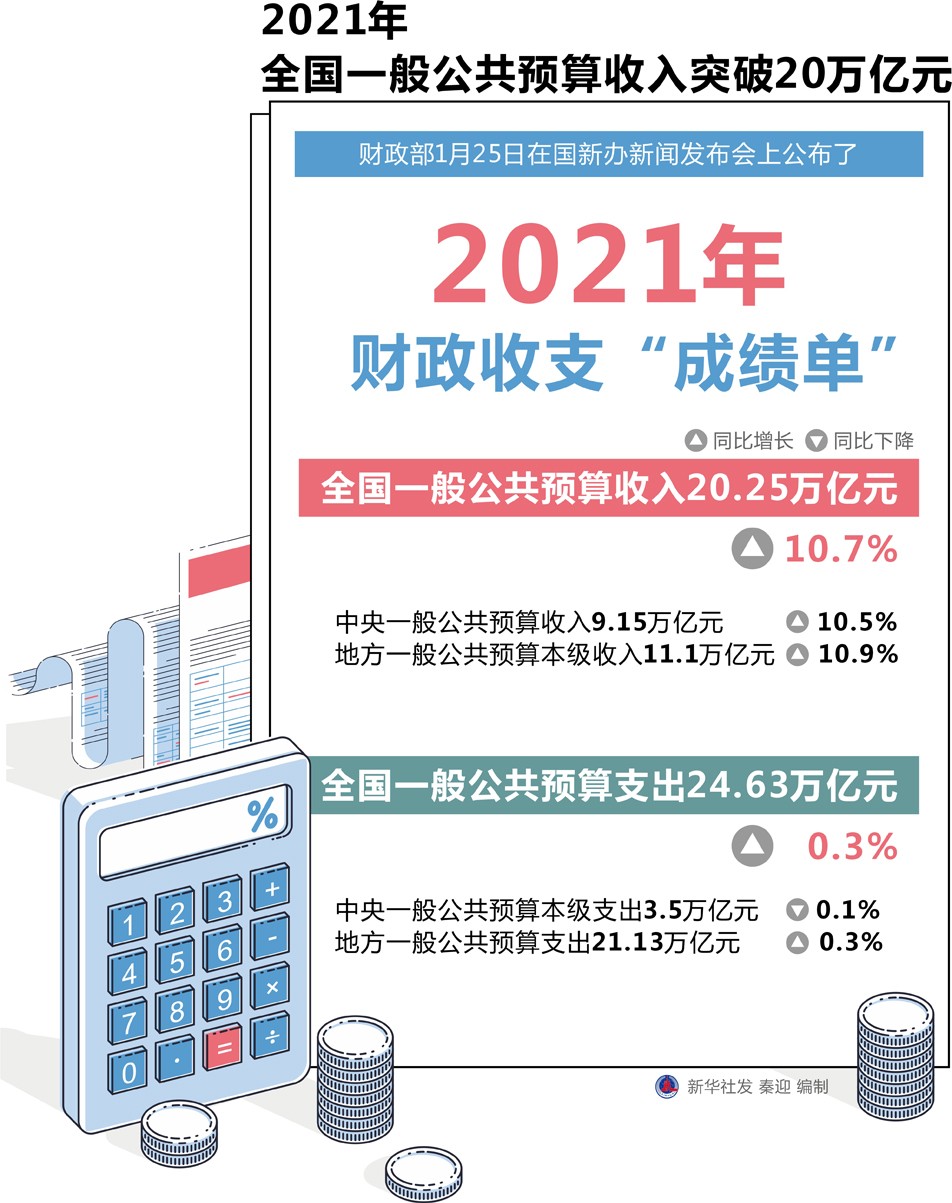 財(cái)政部1月25日在國新辦新聞發(fā)布會(huì)上公布了2021年財(cái)政收支“成績單”。數(shù)據(jù)顯示,2021年,全國一般公共預(yù)算收入20.25萬億元,同比增長10.7%;全國一般公共預(yù)算支出24.63萬億元,同比增長0.3%。