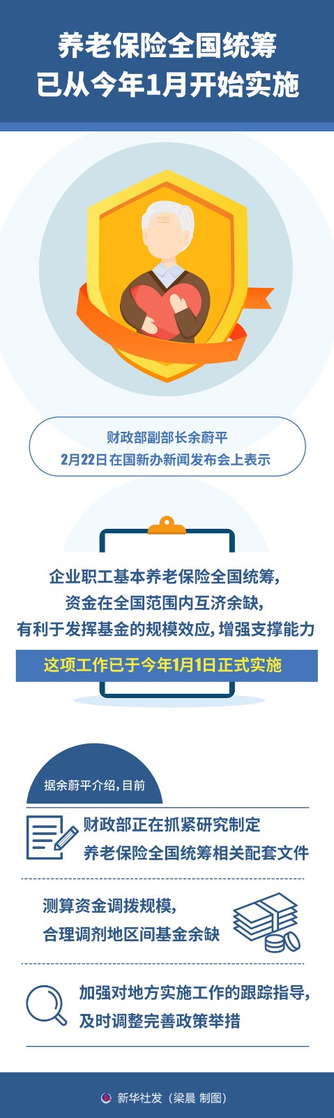 財政部副部長余蔚平2月22日在國新辦新聞發(fā)布會上表示,企業(yè)職工基本養(yǎng)老保險全國統(tǒng)籌,資金在全國范圍內(nèi)互濟余缺,有利于發(fā)揮基金的規(guī)模效應(yīng),增強支撐能力。這項工作已于今年1月1日正式實施。