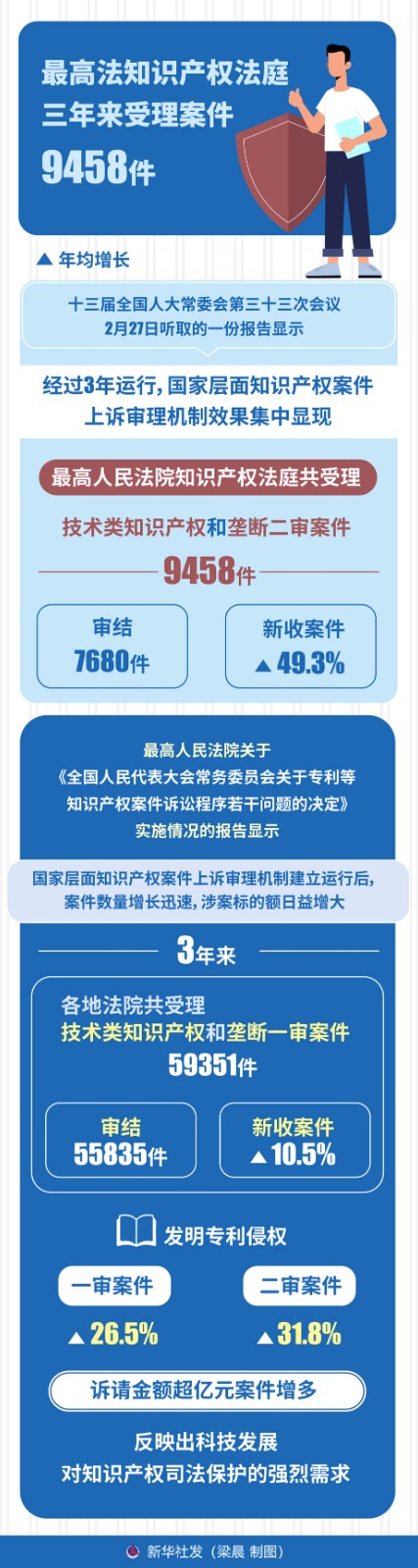十三屆全國人大常委會第三十三次會議2月27日聽取的一份報告顯示,經(jīng)過3年運(yùn)行,國家層面知識產(chǎn)權(quán)案件上訴審理機(jī)制效果集中顯現(xiàn),最高人民法院知識產(chǎn)權(quán)法庭共受理技術(shù)類知識產(chǎn)權(quán)和壟斷二審案件9458件,審結(jié)7680件,新收案件年均增長49.3%。