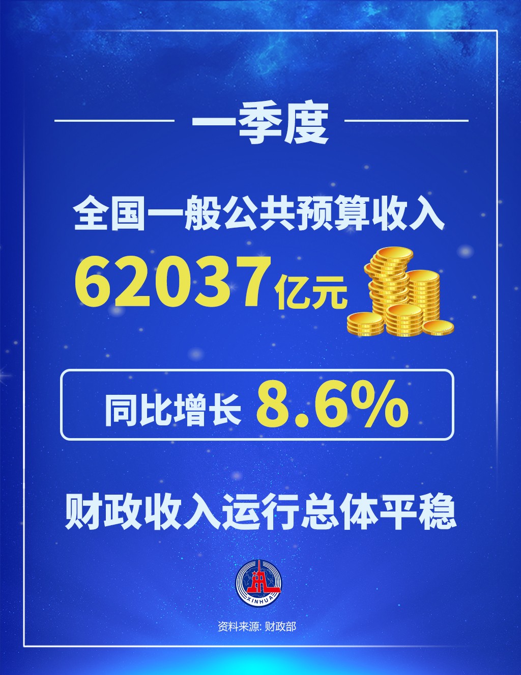 財(cái)政部4月20日發(fā)布數(shù)據(jù)顯示,一季度,全國(guó)一般公共預(yù)算收入62037億元,同比增長(zhǎng)8.6%,財(cái)政收入運(yùn)行總體平穩(wěn)。