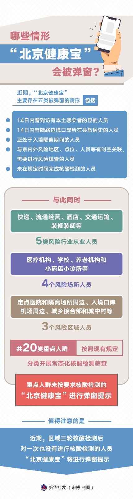 近期,“北京健康寶”主要存在五類被彈窗的情形,包括14日內(nèi)曾到訪有本土感染者的縣的人員;14日內(nèi)有陸路邊境口岸所在縣旅居史的人員;正處于入境隔離期間的人員;與京內(nèi)外風(fēng)險(xiǎn)地區(qū)、點(diǎn)位、人員等有時(shí)空關(guān)聯(lián),需要進(jìn)行風(fēng)險(xiǎn)排查的人員;未在規(guī)定時(shí)間完成核酸檢測(cè)的人員。