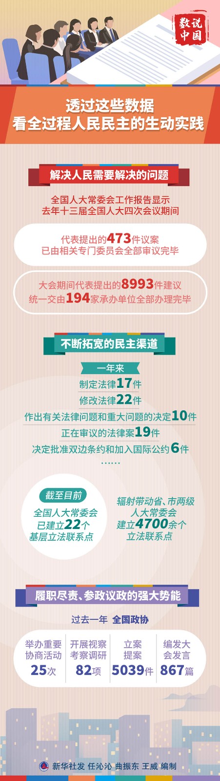 翻開提請(qǐng)審議的全國(guó)人大常委會(huì)工作報(bào)告、全國(guó)政協(xié)常委會(huì)工作報(bào)告,其中的一組組數(shù)據(jù),躍動(dòng)著民主的生機(jī)活力,彰顯全過程人民民主的實(shí)踐邏輯、獨(dú)特優(yōu)勢(shì)。