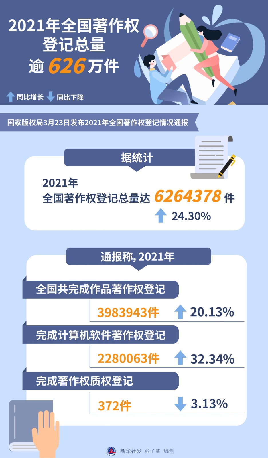 國(guó)家版權(quán)局3月23日發(fā)布2021年全國(guó)著作權(quán)登記情況通報(bào)。據(jù)統(tǒng)計(jì),2021年全國(guó)著作權(quán)登記總量達(dá)6264378件,同比增長(zhǎng)24.30%。