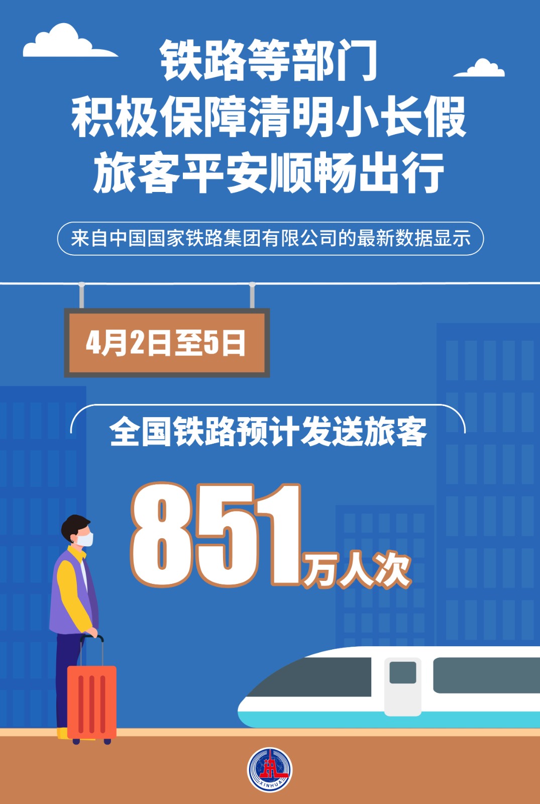 全國鐵路清明假期運(yùn)輸期限為4月2日至5日共4天。來自中國國家鐵路集團(tuán)有限公司的最新數(shù)據(jù)顯示,2日至5日,全國鐵路預(yù)計(jì)發(fā)送旅客851萬人次,鐵路運(yùn)輸平穩(wěn)有序。