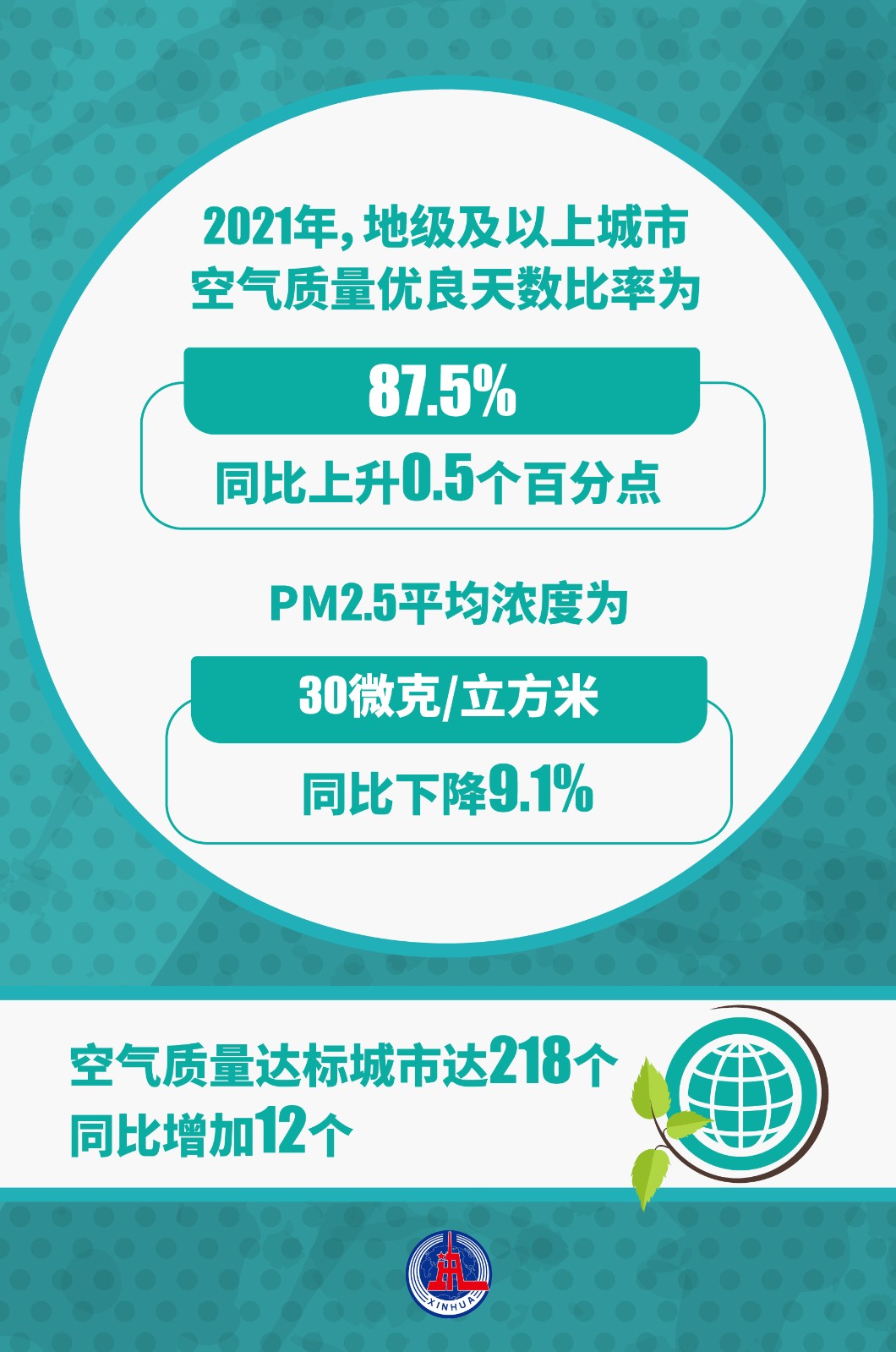 國務院關(guān)于2021年度環(huán)境狀況和環(huán)境保護目標完成情況的報告4月18日提請全國人大常委會會議審議。報告顯示,2021年,地級及以上城市空氣質(zhì)量優(yōu)良天數(shù)比率為87.5%,同比上升0.5個百分點;PM2.5平均濃度為30微克/立方米,同比下降9.1%??諝赓|(zhì)量達標城市達218個,同比增加12個。