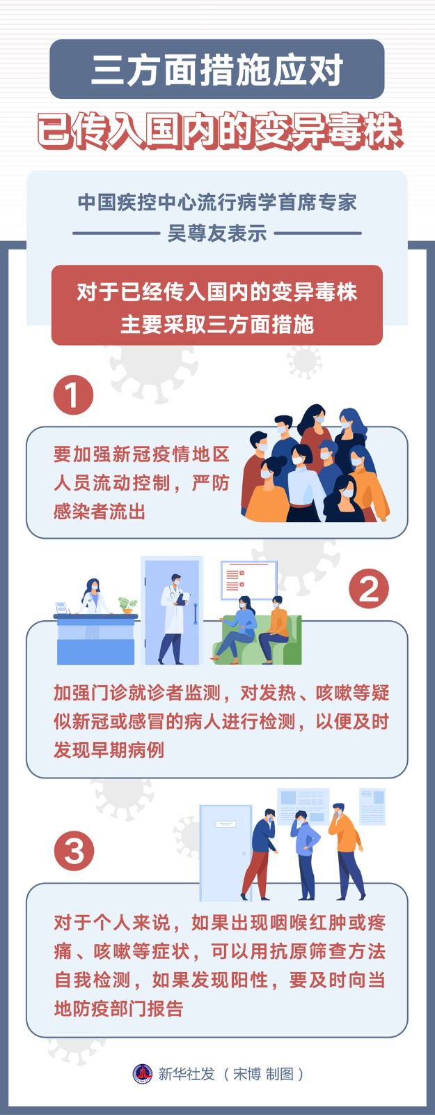 中國(guó)疾控中心流行病學(xué)首席專(zhuān)家吳尊友表示,對(duì)于已經(jīng)傳入國(guó)內(nèi)的變異毒株,主要采取三方面措施。