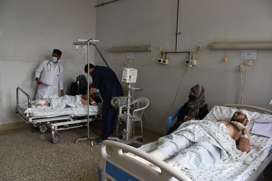5月26日,在阿富汗北部巴爾赫省首府馬扎里沙里夫一所醫(yī)院,爆炸事件中的傷者接受治療。