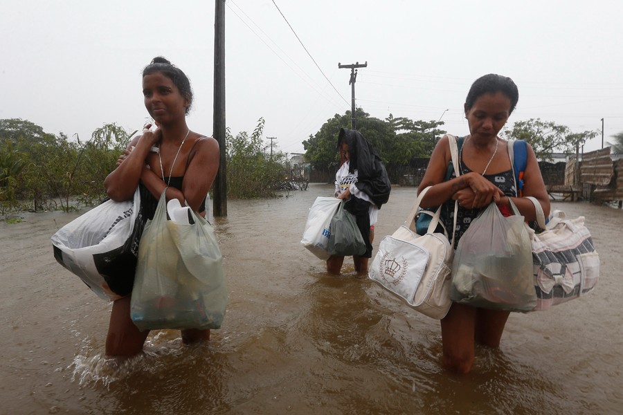 6月4日,人們走在巴西累西腓大都市區(qū)穆里貝卡鎮(zhèn)被洪水淹沒的街道上。