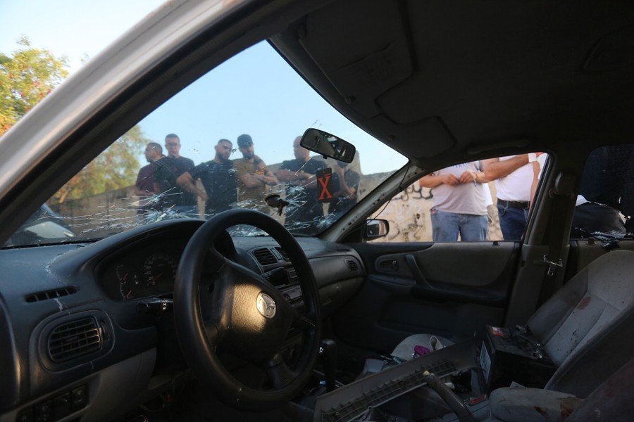 6月17日,在約旦河西岸北部城市杰寧,人們查看被打死的巴勒斯坦人乘坐的車輛。