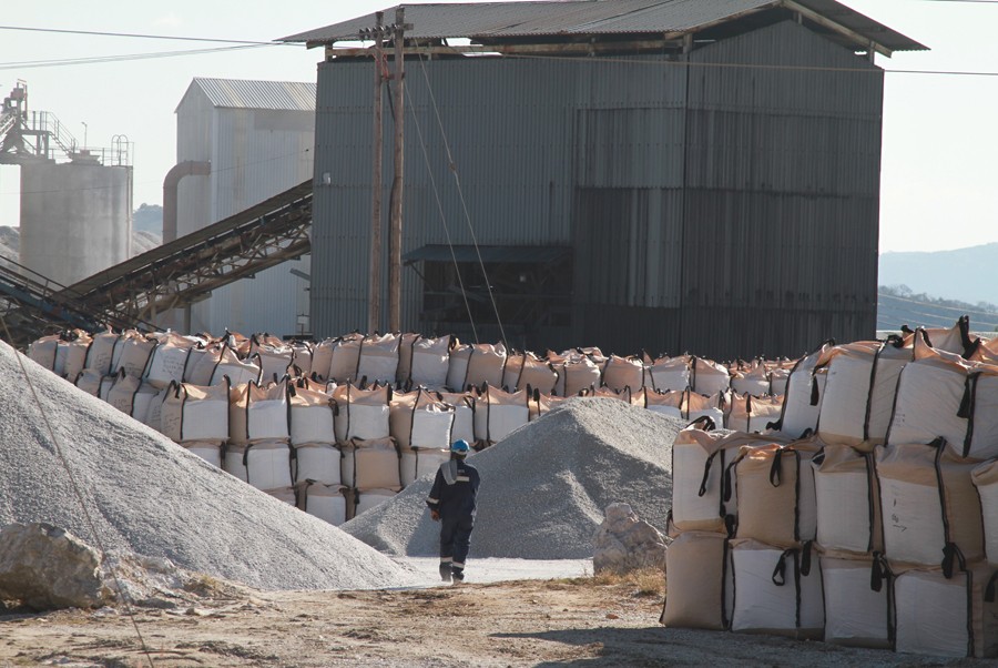 6月17日,在津巴布韋馬斯溫戈省的比基塔礦,工人從袋裝鋰精礦旁走過。