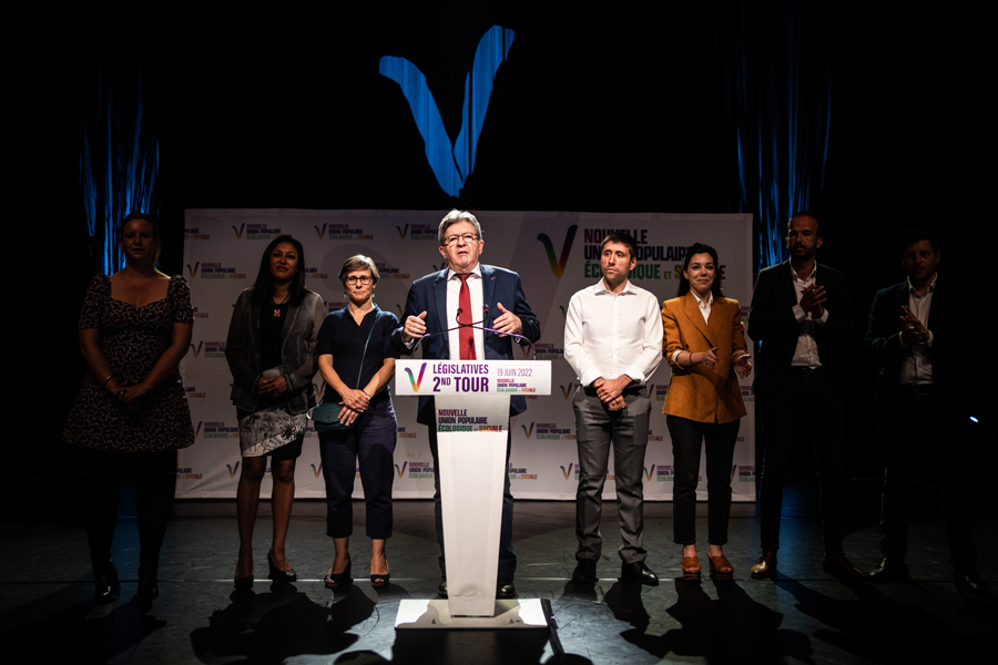 6月19日,法國極左翼政黨“不屈法國”領導人梅朗雄在巴黎舉行的選后集會上講話。