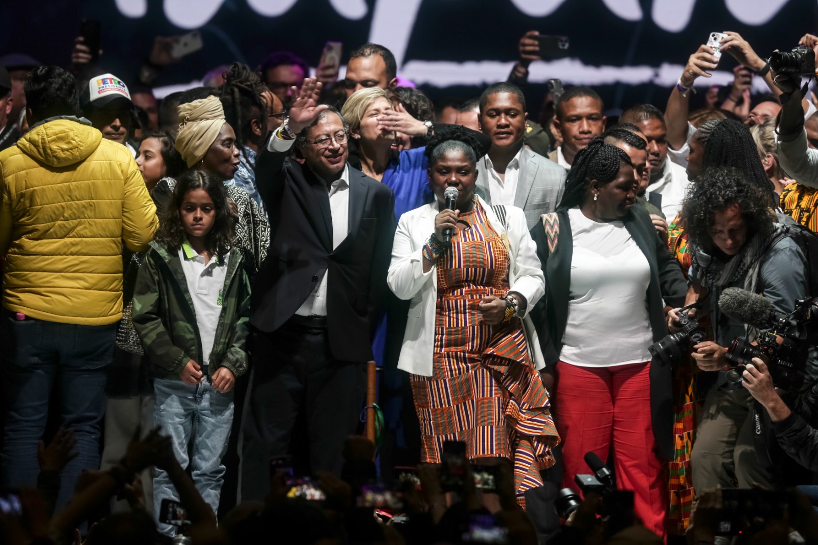 6月19日,左翼競(jìng)選聯(lián)盟“哥倫比亞歷史公約聯(lián)盟”候選人古斯塔沃·佩特羅(前左三)與他的競(jìng)選搭檔弗朗西亞·馬爾克斯(前左四)在哥倫比亞首都波哥大慶祝大選獲勝。
