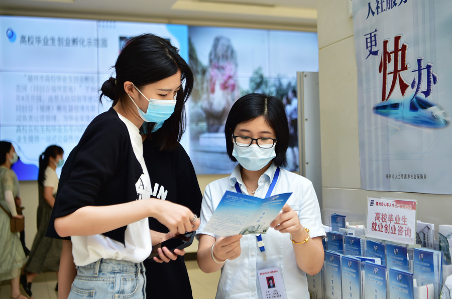 在福州市人事人才公共服務中心,集美大學誠毅學院的一名畢業(yè)生(前左)向工作人員咨詢1萬元一次性生活補貼的申報領取手續(xù)(6月29日攝)。
