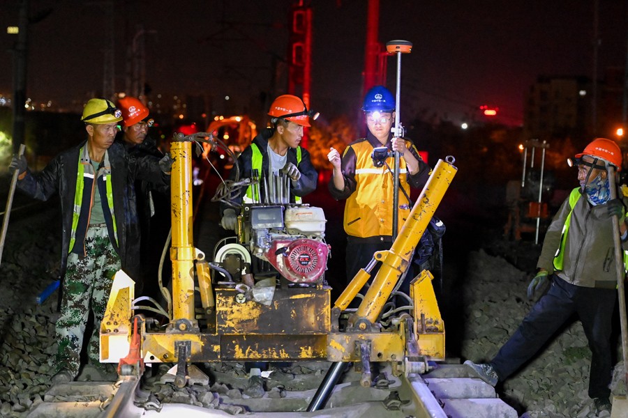 6月29日,在烏將鐵路地窩鋪車站擴(kuò)能改造施工現(xiàn)場(chǎng),中鐵一局的施工人員進(jìn)行起道作業(yè)。
