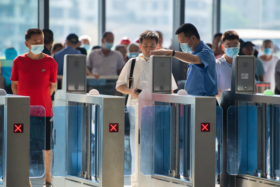 7月1日,在株洲火車(chē)站安檢區(qū),旅客進(jìn)行人臉識(shí)別通過(guò)安檢。