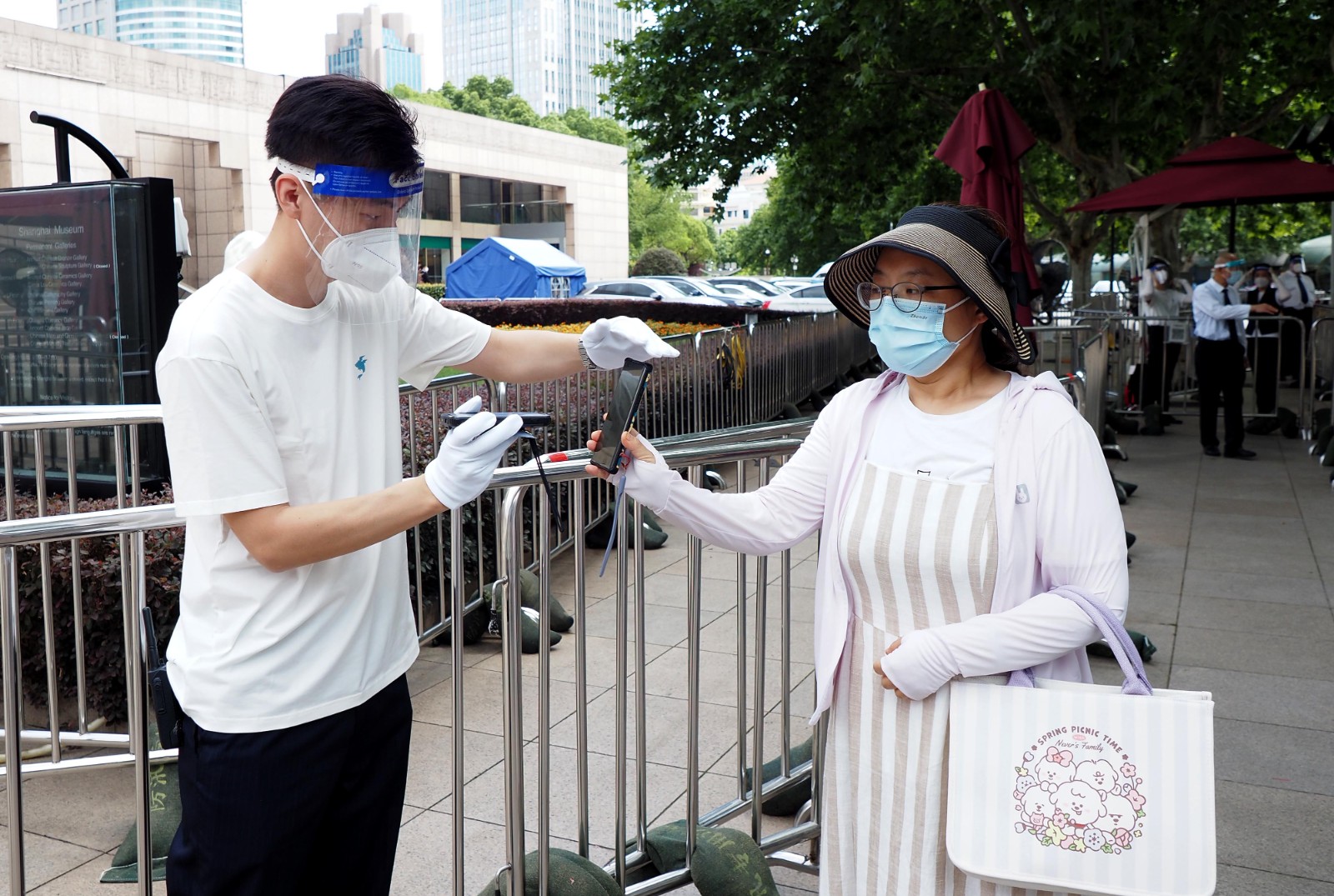 7月1日,上海博物館恢復(fù)對(duì)公眾開放。觀眾在查驗(yàn)“隨申碼”后入場(chǎng)參觀。