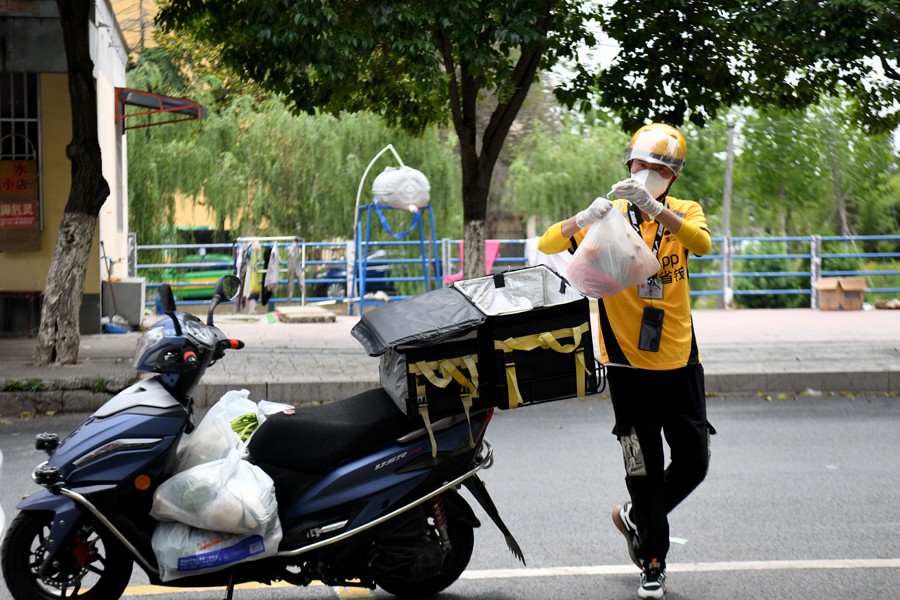 今年27歲的譚章夢是安徽省宿州市泗縣的一名外賣小哥。泗縣本輪新冠肺炎疫情發(fā)生后,譚章夢主動向公司申請加入物資保供組,忙碌在疫情防控一線,為一家大型保供商超提供配送服務(wù),保障米面蔬菜等生活必需物資的配送。