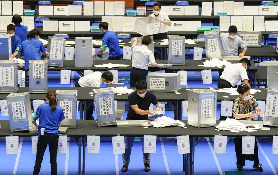 7月10日,工作人員在日本東京港區(qū)體育中心進(jìn)行參議院選舉投票開票作業(yè)。