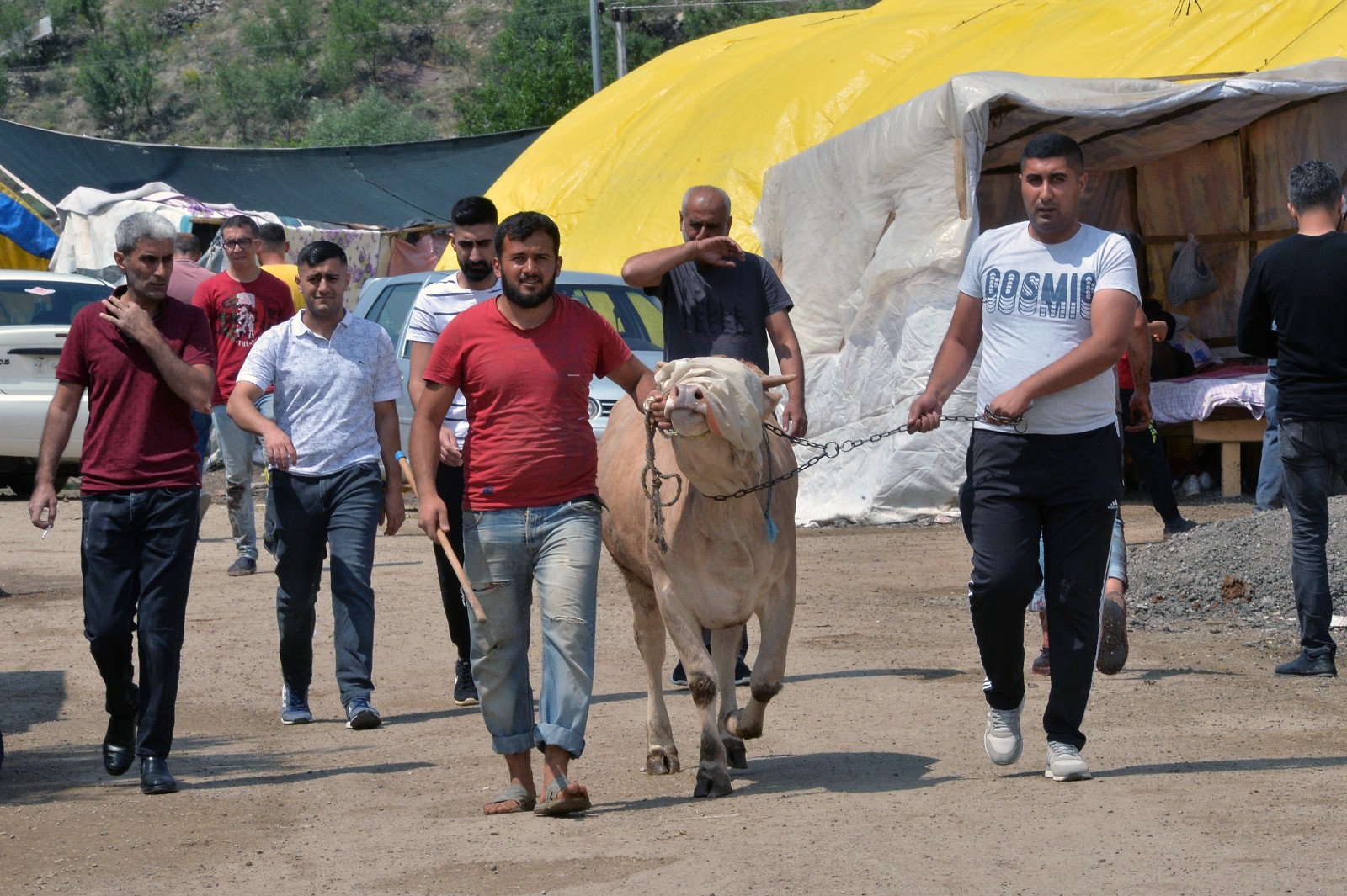 7月9日,人們牽著牛走過(guò)土耳其安卡拉一處牲畜市場(chǎng)。