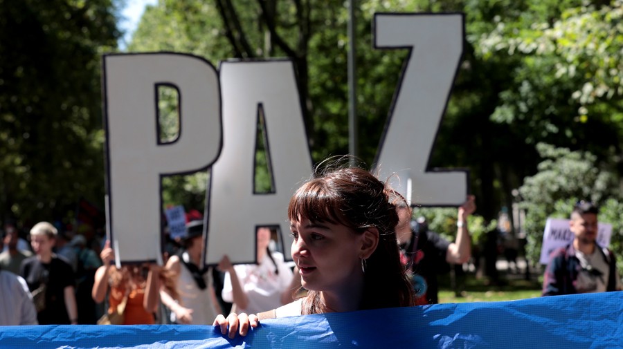 數(shù)千人26日在西班牙首都馬德里市中心參加反對北約、呼吁世界和平大游行。