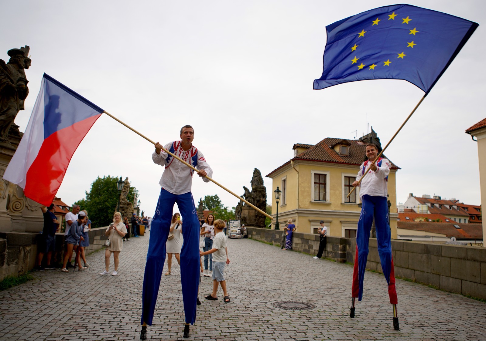 7月1日,人們?cè)诮菘耸锥疾祭窭铣菂^(qū)揮舞捷克國(guó)旗和歐盟旗幟。