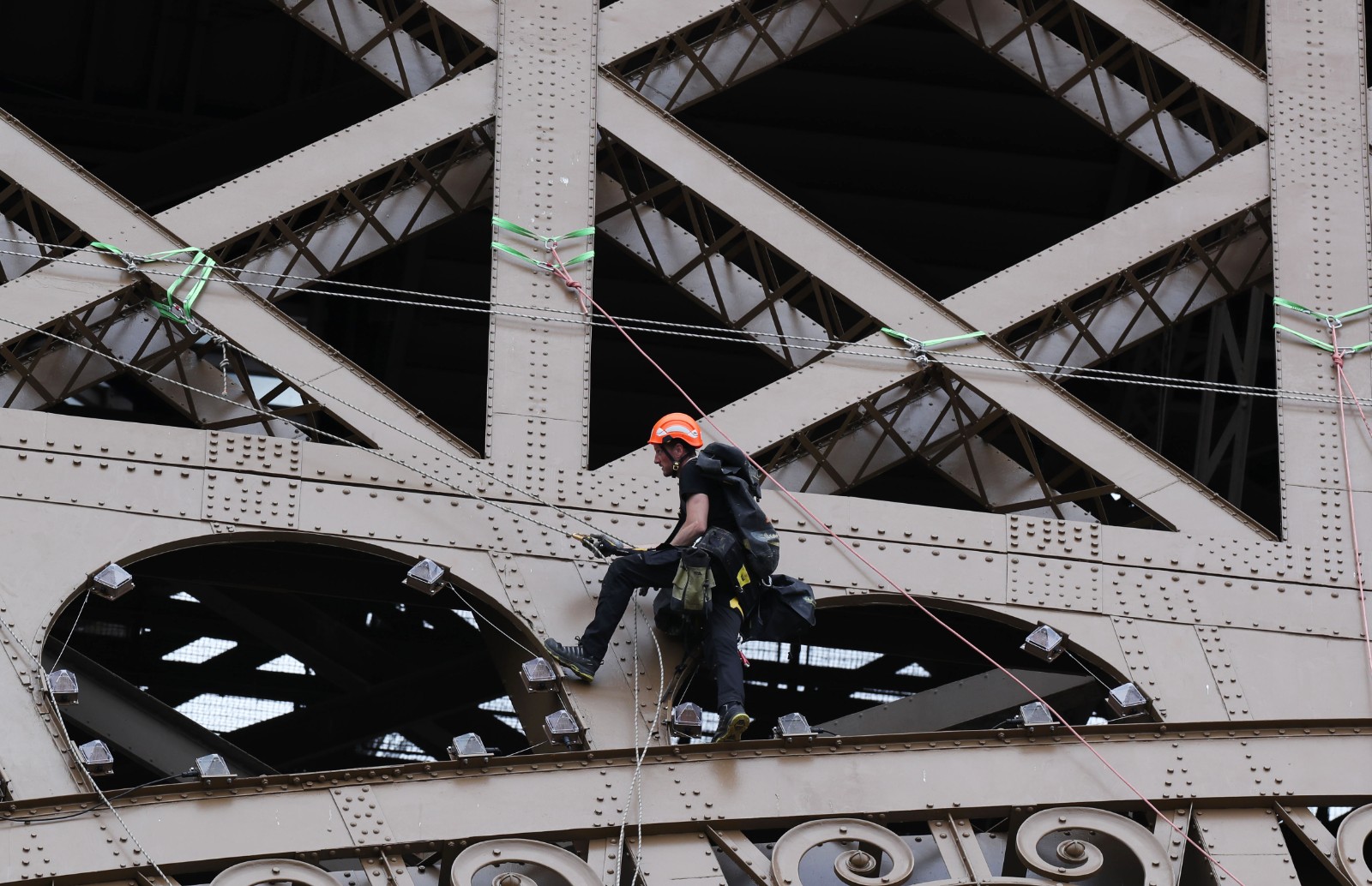 7月7日,工人在法國巴黎埃菲爾鐵塔上高空作業(yè)。