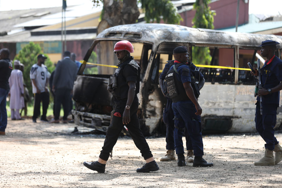 7月6日,在尼日利亞首都阿布賈,幾名警察在監(jiān)獄遇襲現(xiàn)場警戒。
