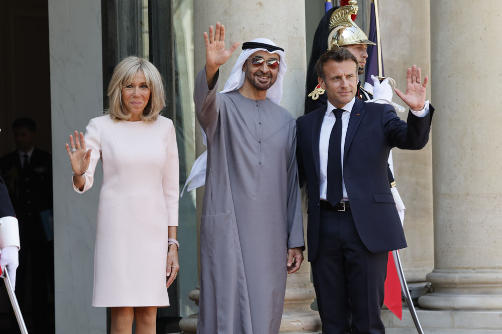 7月18日,法國(guó)總統(tǒng)馬克龍(右)和夫人布麗吉特在巴黎總統(tǒng)府愛麗舍宮迎接到訪的阿拉伯聯(lián)合酋長(zhǎng)國(guó)總統(tǒng)穆罕默德(中)。
