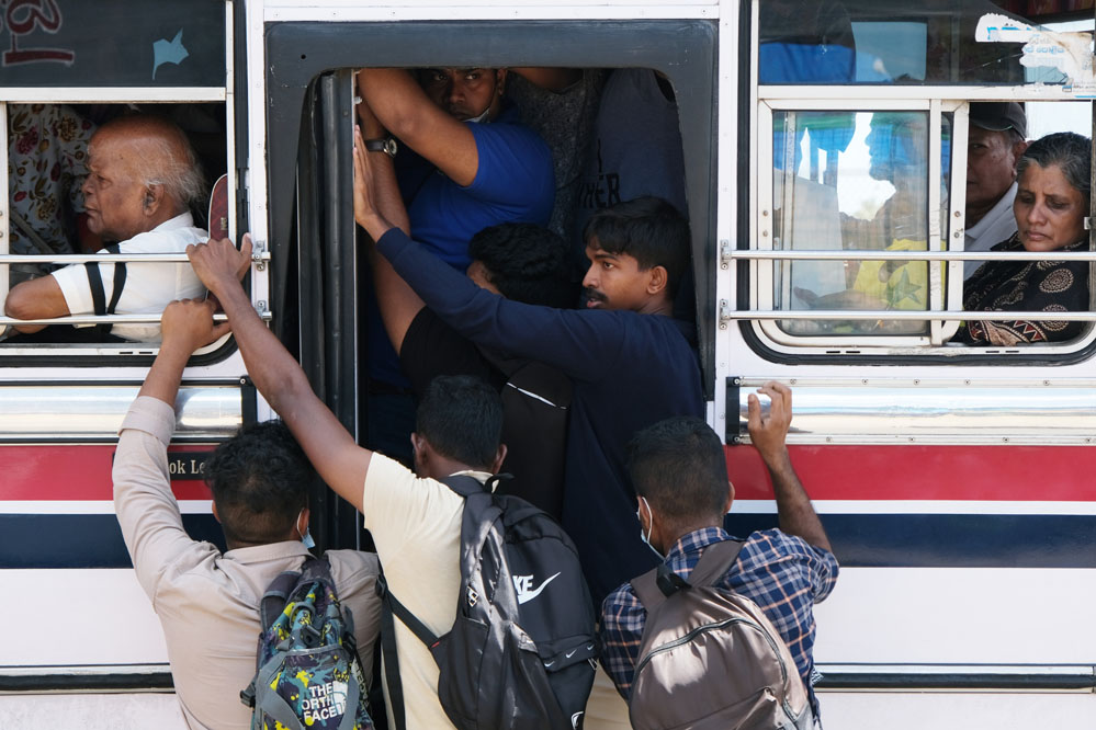 7月18日,在斯里蘭卡首都科倫坡,人們擠在公交車門外乘車。