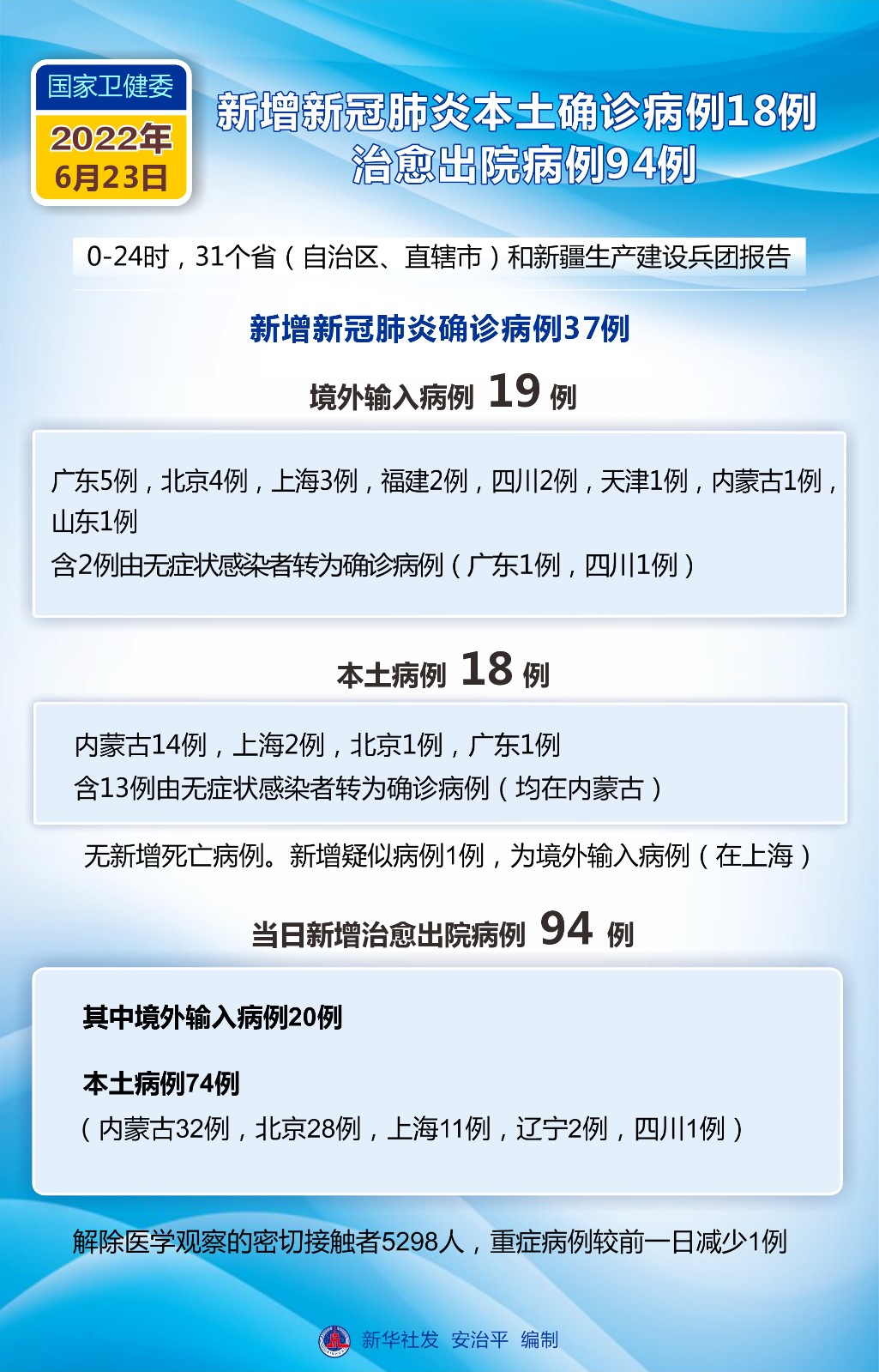 圖表:國家衛(wèi)健委:6月23日新增新冠肺炎本土確診病例18例 治愈出院病例94例