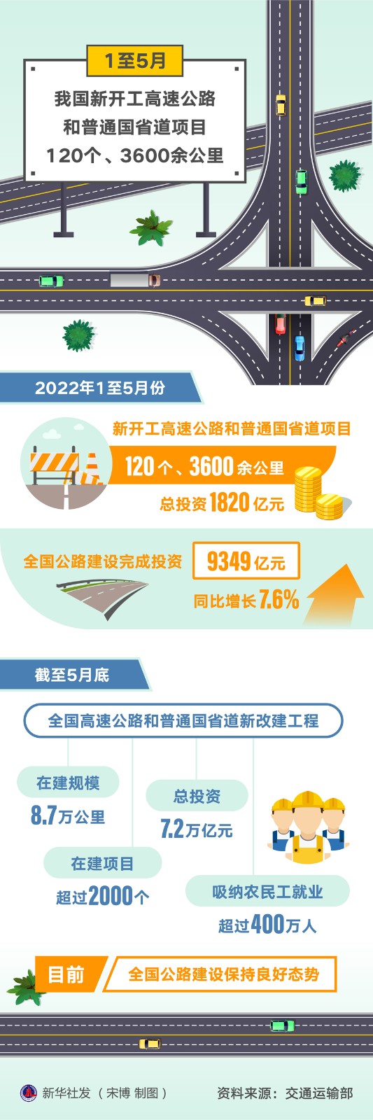 在6月27日舉行的國新辦發(fā)布會上,趙沖久表示,1至5月,全國公路建設(shè)完成投資9349億元,同比增長7.6%。截至5月底,全國高速公路和普通國省道新改建工程在建規(guī)模8.7萬公里,在建項(xiàng)目超過2000個,總投資7.2萬億元,吸納農(nóng)民工就業(yè)超過400萬人?!澳壳?,全國公路建設(shè)保持良好態(tài)勢。”