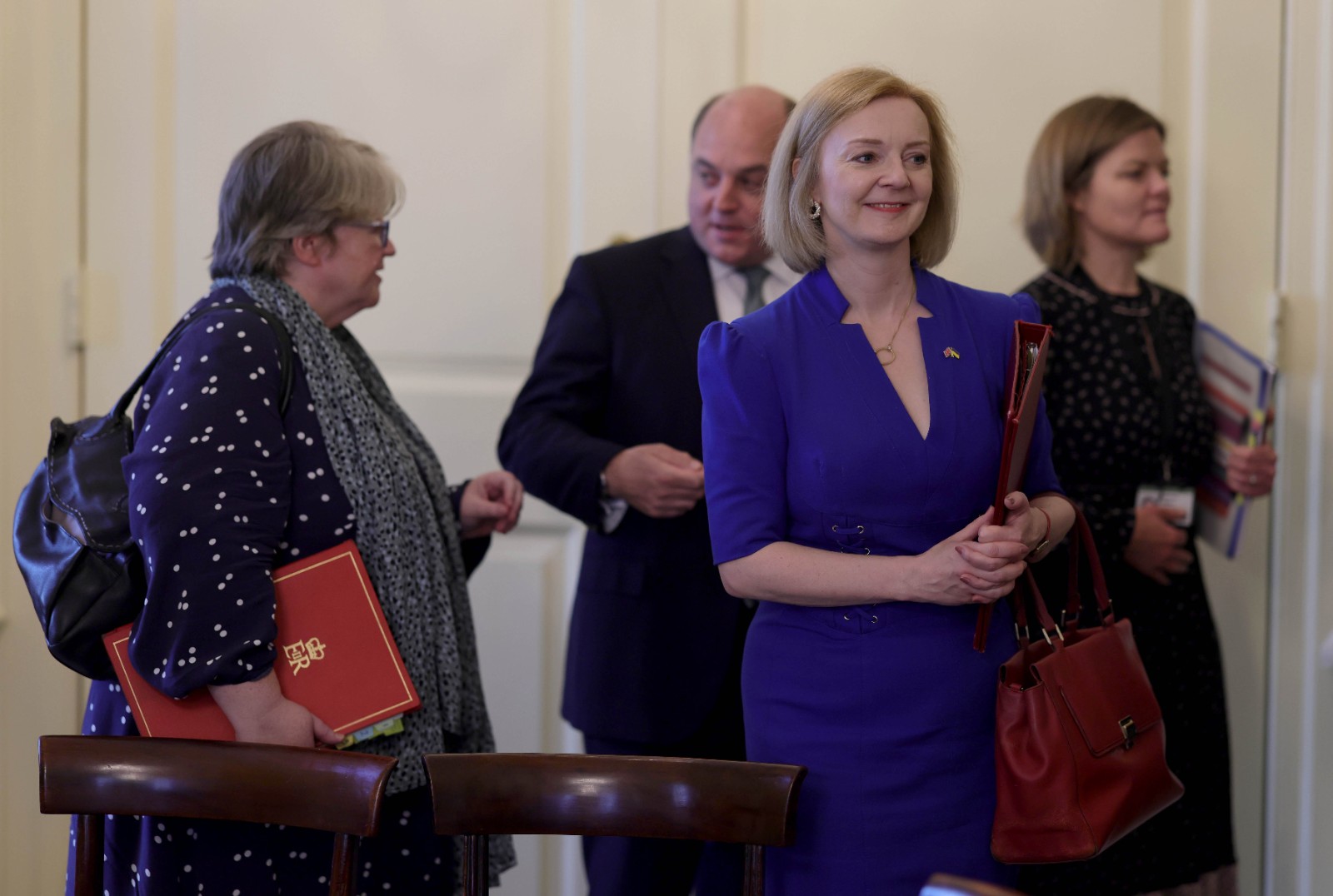 這是伊麗莎白·特拉斯(右二)在英國倫敦首相府參加內(nèi)閣會議后離開的資料照片(7月12日攝)。