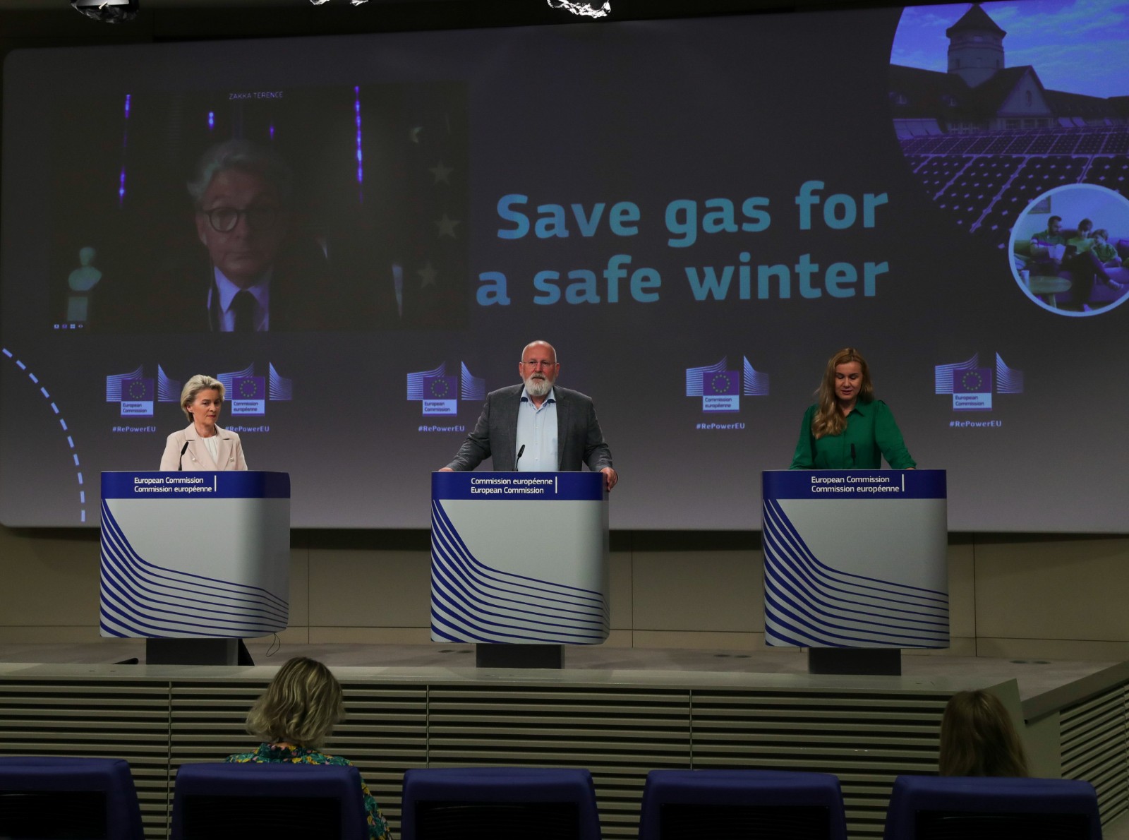 7月20日,在比利時(shí)布魯塞爾,歐盟委員會(huì)主席馮德萊恩(左一)、歐盟委員會(huì)執(zhí)行副主席蒂默曼斯(右二)、負(fù)責(zé)內(nèi)部市場(chǎng)的歐盟委員蒂埃里·布雷東(視頻參會(huì))、負(fù)責(zé)能源事務(wù)的歐盟委員卡德麗·西姆松(右一)出席新聞發(fā)布會(huì)。