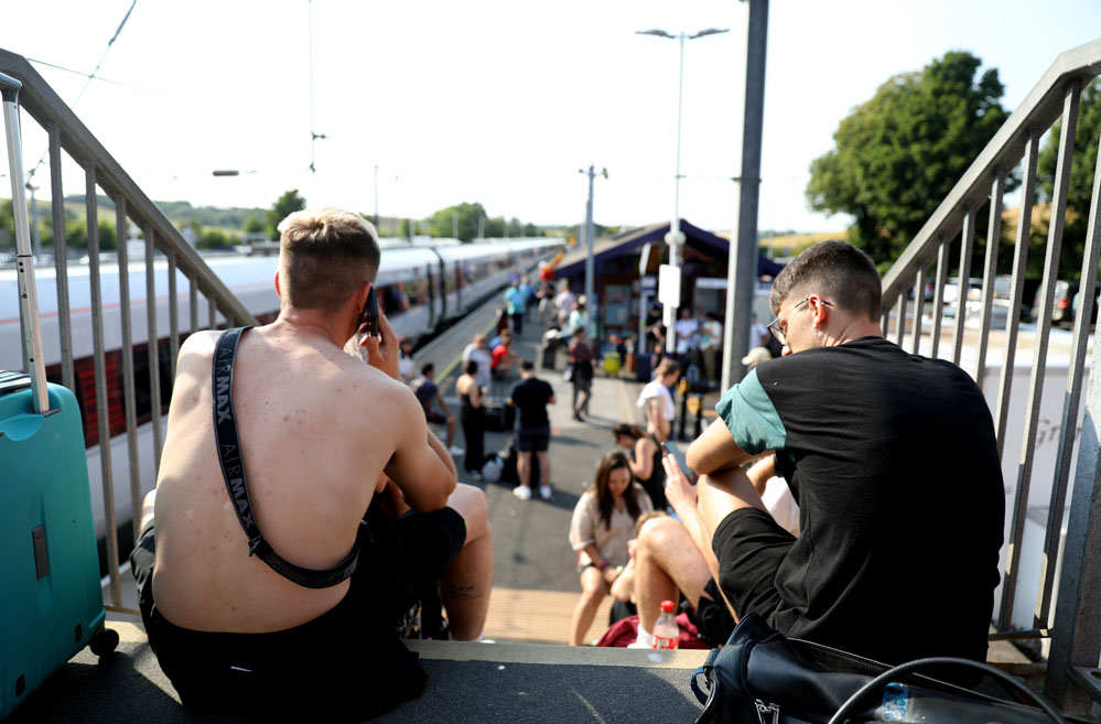 7月18日,在英國阿爾恩茅斯火車站,由于天氣炎熱,前方線路起火,一列由愛丁堡出發(fā)至倫敦的火車被迫在此停止運行,旅客滯留在火車站。