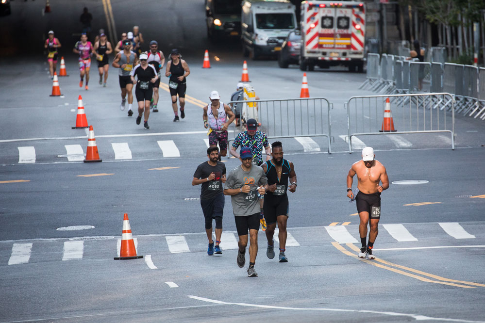 7月24日,人們在美國紐約參加鐵人三項比賽,當(dāng)日的比賽賽程因高溫縮短。