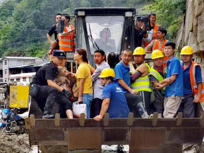 圖為綿陽市公安局特巡警支隊特警大隊民警和其他救援人員一起乘坐推土機前往災(zāi)情嚴重地點救援群眾。