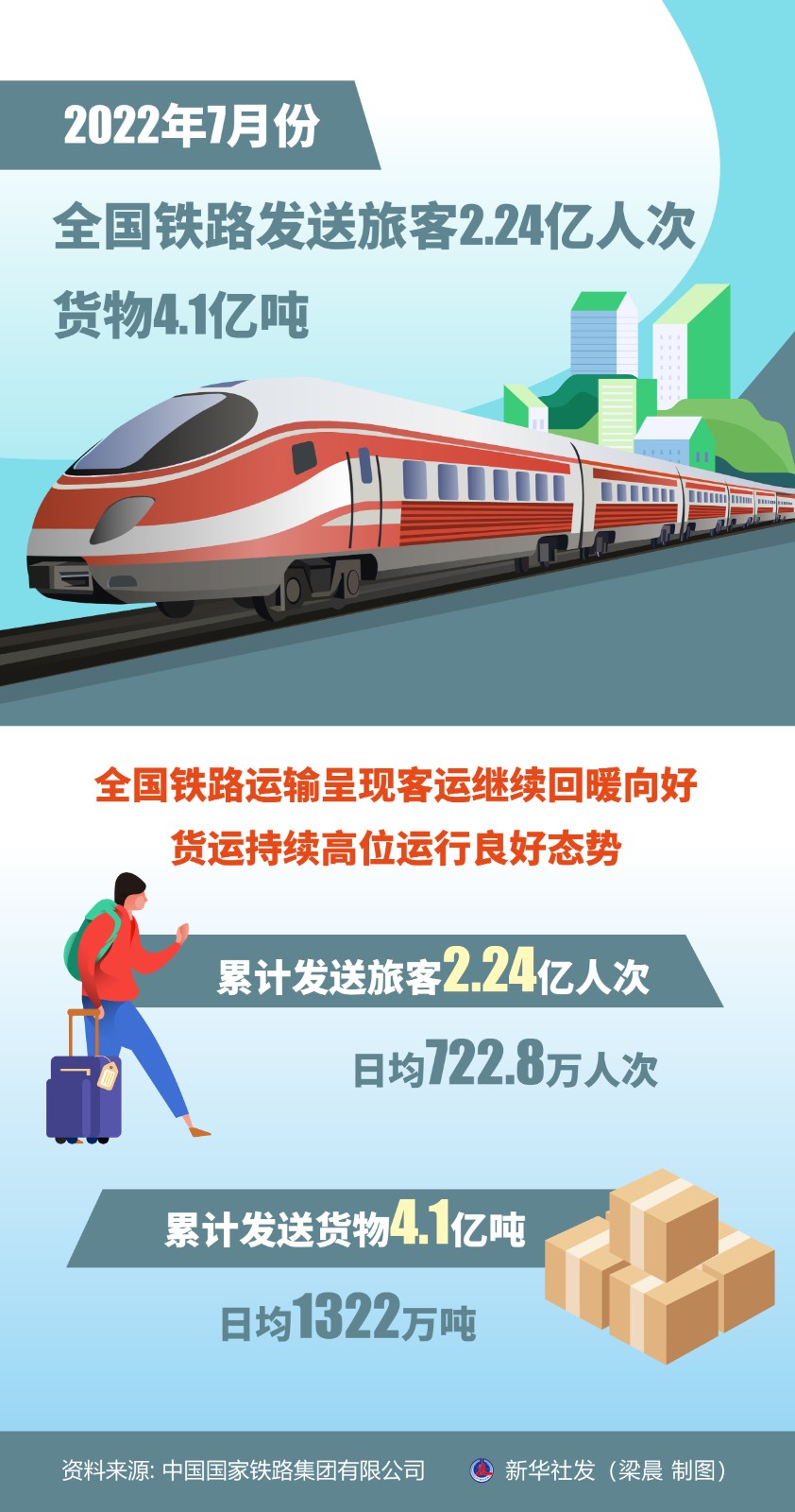 記者8月1日從中國國家鐵路集團有限公司獲悉,7月份,全國鐵路運輸呈現(xiàn)客運繼續(xù)回暖向好、貨運持續(xù)高位運行良好態(tài)勢,累計發(fā)送旅客2.24億人次,日均722.8萬人次;累計發(fā)送貨物4.1億噸,日均1322萬噸。