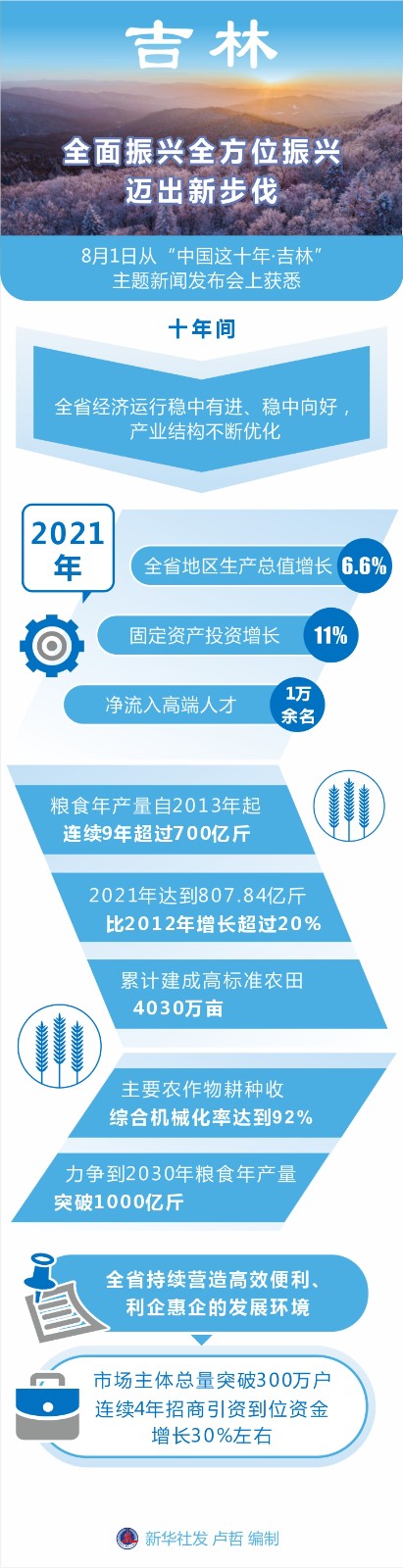 記者從8月1日舉行的“中國這十年·吉林”主題新聞發(fā)布會上了解到,10年間,吉林全省經(jīng)濟運行穩(wěn)中有進(jìn)、穩(wěn)中向好,產(chǎn)業(yè)結(jié)構(gòu)不斷優(yōu)化,全省糧食年產(chǎn)量連續(xù)跨上700億斤、800億斤臺階,營商環(huán)境持續(xù)改善,全面振興全方位振興邁出新步伐。