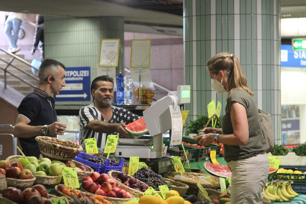 8月2日,顧客在德國(guó)法蘭克福一家攤位前購(gòu)買(mǎi)水果。
