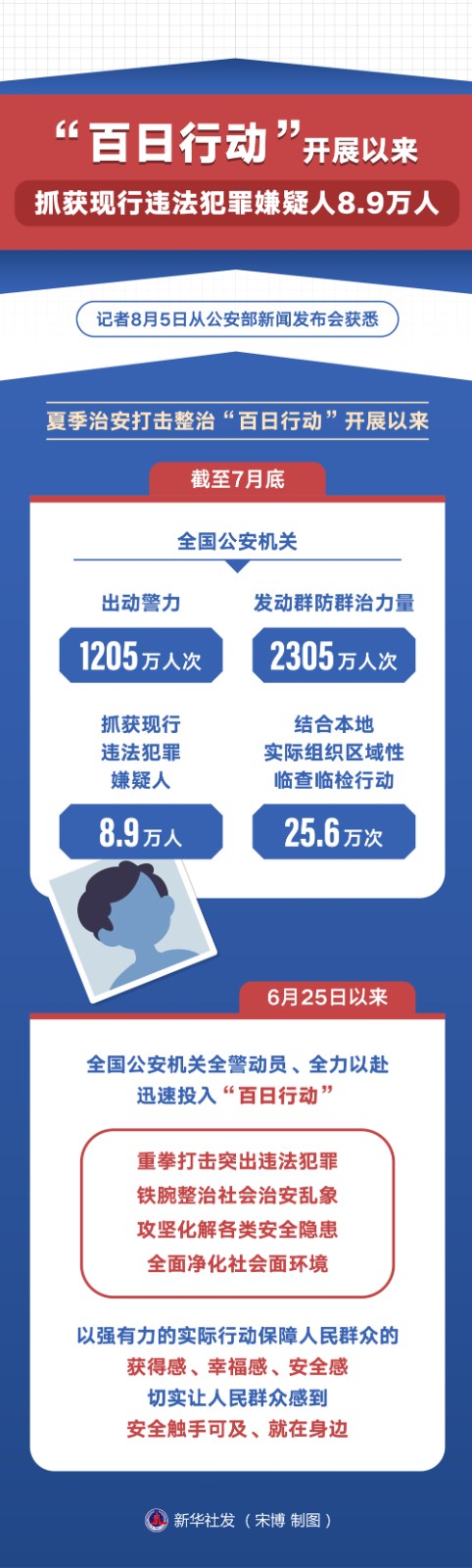 記者8月5日從公安部新聞發(fā)布會獲悉,夏季治安打擊整治“百日行動”開展以來,截至7月底,全國公安機(jī)關(guān)出動警力1205萬人次,發(fā)動群防群治力量2305萬人次,抓獲現(xiàn)行違法犯罪嫌疑人8.9萬人,結(jié)合本地實際組織區(qū)域性臨查臨檢行動25.6萬次。